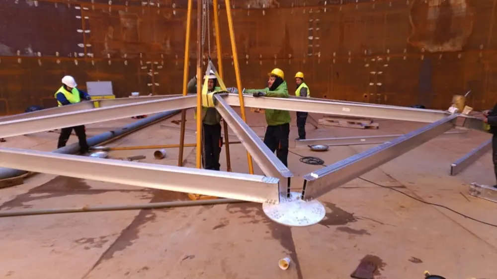 The TankDome is ideal for both new installations and retrofitting of existing tanks. Its hemispherical, self-supporting structure distributes stress without the need for internal columns, allowing efficient assembly without interrupting operations. Made of high-strength aluminum alloys, it withstands extreme conditions with minimal maintenance and complies with API 650 and EUROCODE standards.